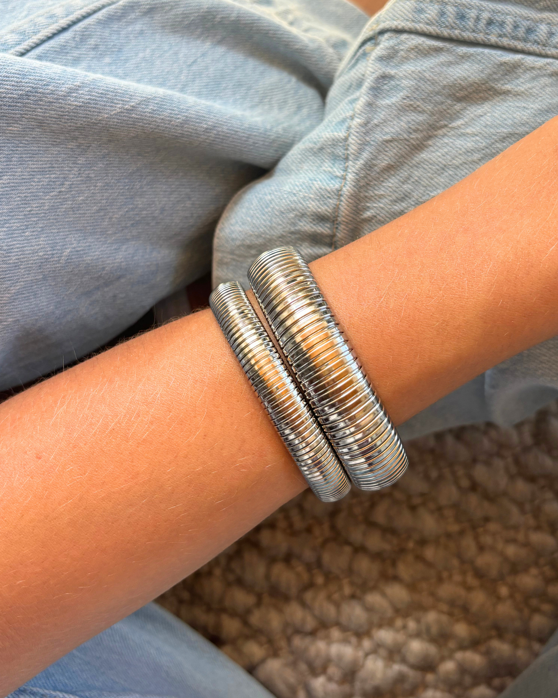 - Bevat de smalle bangle met strepen en de brede bangle met strepen